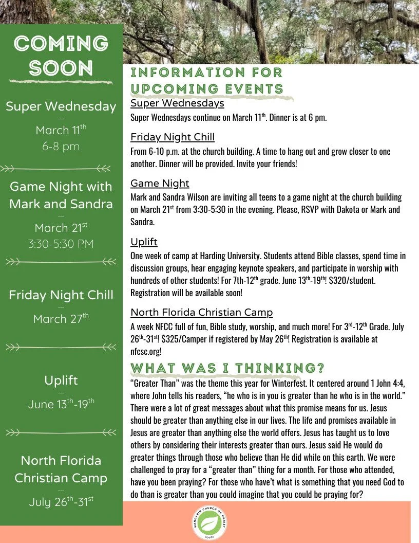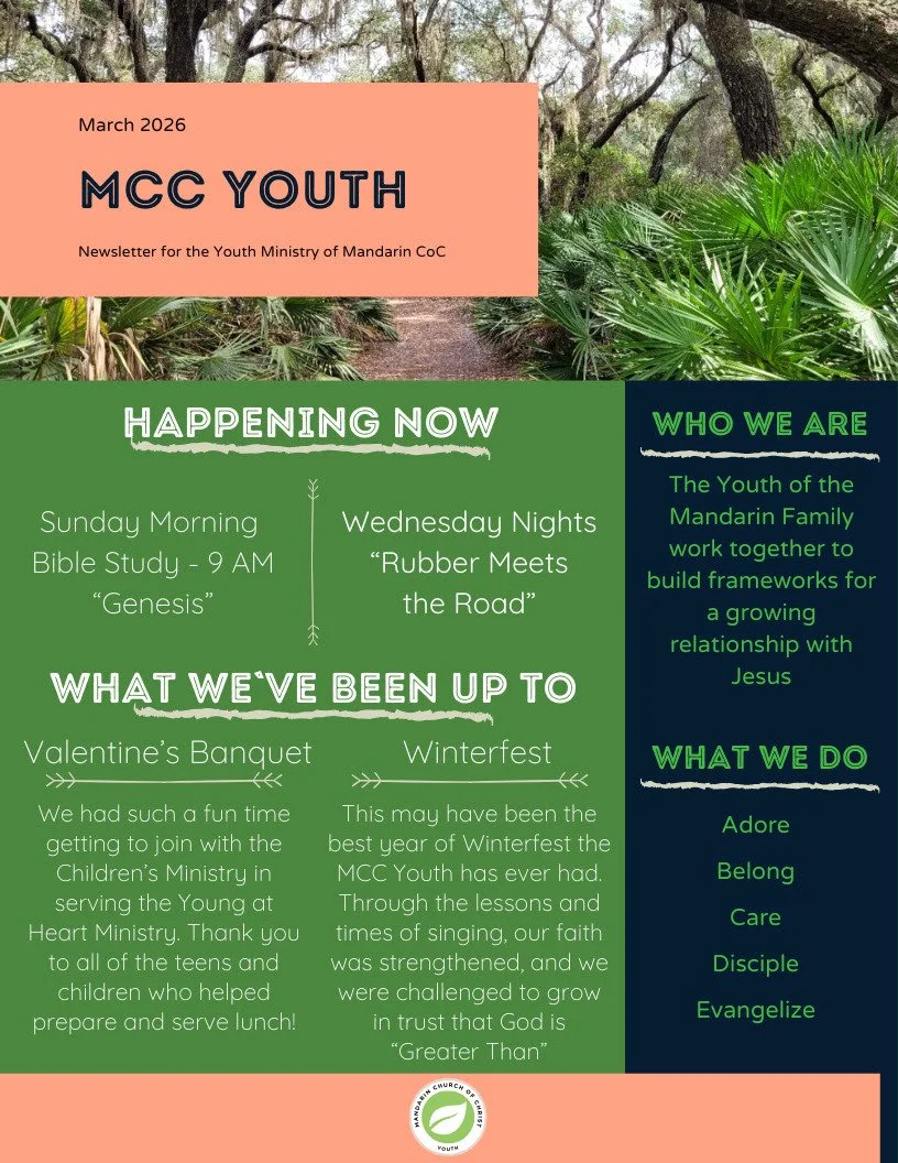 The church is here to help parents, not replace them. Your teens are going to love it at Mandarin Church of Christ, and Mandarin is going to love your teens!